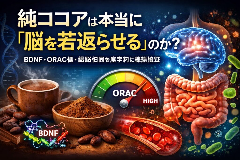 確かにカカオポリフェノールには血管拡張作用があり、BDNF(脳由来神経栄養因子)への影響も研究されています。しかし、ORAC値が高い=寿命が延びる、という単純な話ではありません。
