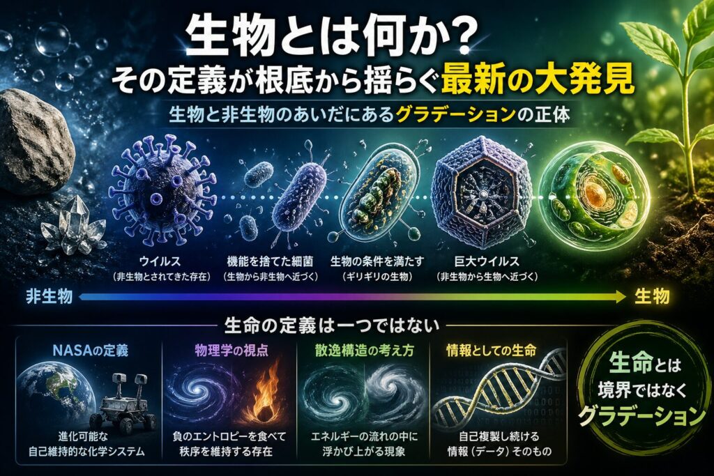 - 生物と非生物の間には、ゆるやかな連続(グラデーション)がある