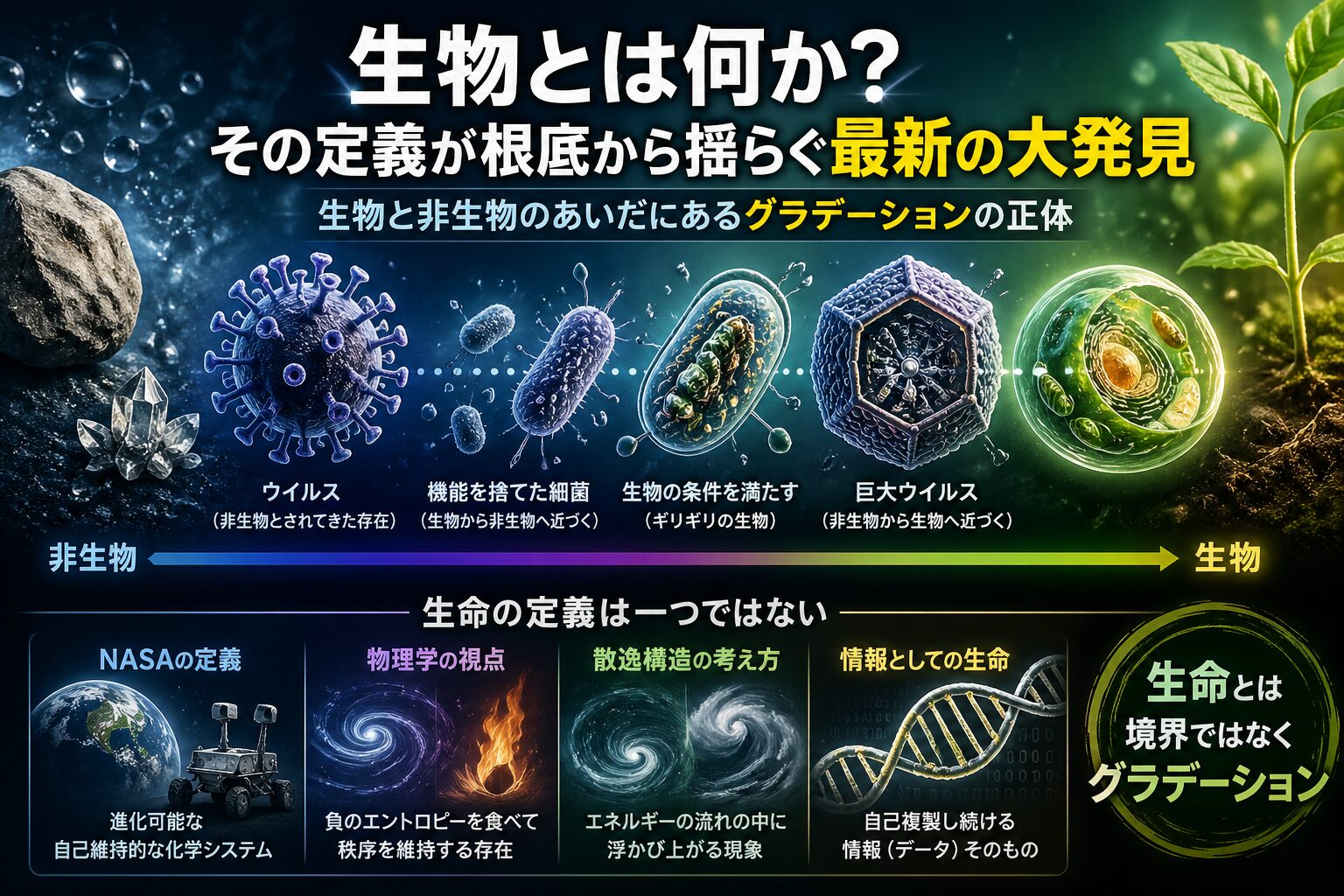 最新の研究では、生命と非生命のあいだに明確な境界線は存在しないことが明らかになりつつあります。