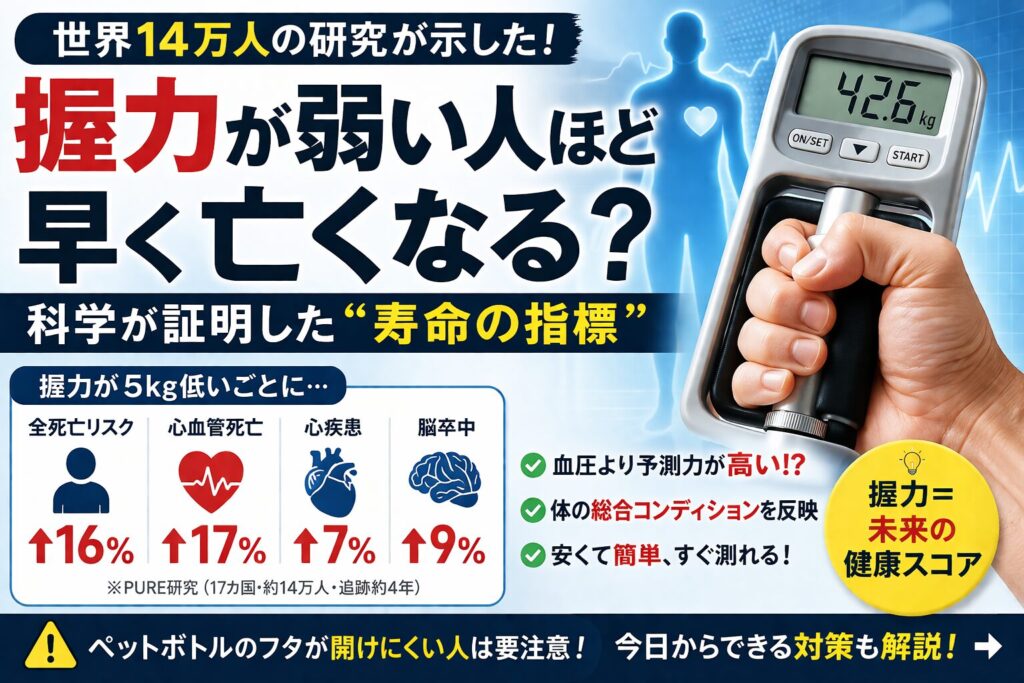 握力が弱い人ほど、心臓病・脳卒中・そして全死亡のリスクが明確に高いことが示されました。