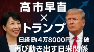 未分類 高市早苗×トランプが動かす新時代――日経平均4万8000円突破の裏で何が起きているのか 日本の政治と経済が、再び世界の注目を集めています。自民党総裁に高市早苗氏が選出され、トランプ前大統領が即座に祝福メッセージを発表。市場は一気に反応し、日経平均株価は4万8000円を突破しました。 この現象は単なる一時的な高揚... 2025.10.07 未分類