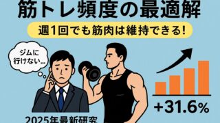 健康 【2025年最新版】筋トレ頻度の最適解:週1回でも筋肉は維持できる!科学が示す「筋肥大・維持の黄金ルール」 「仕事が忙しくてジムに通えない…」「週1回しかトレーニングできないけど、筋肉は落ちないの?」そんな悩みを抱える社会人トレーニーに朗報です。 2025年、キプロス・ニコシア大学から発表された最新研究が、筋肥大と筋力維持に最も効... 2025.10.15 健康