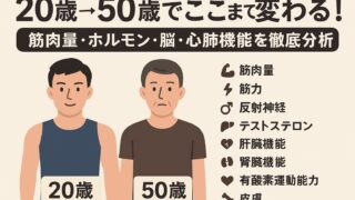 健康 20歳から50歳でここまで変わる!筋肉・ホルモン・脳・心肺機能を徹底分析 あなたの体は、20歳をピークに少しずつ変化していきます。筋肉量は年々減少し、代謝は落ち、肌やホルモンバランスにも違いが現れる──。しかし、それは「老化」という一言で片付けられる単純な現象ではありません。最新の研究では、筋肉・脳・心... 2025.10.09 健康